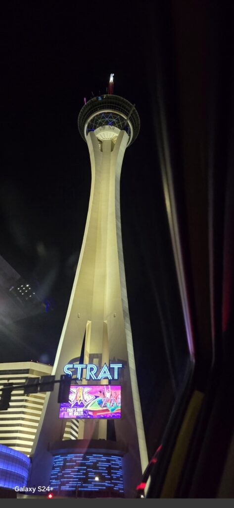 “El hotel Strat” tiene varias atracciones que debes ver, el arco con el nombre de “Las Vegas”, la torre más alta del mundo y en el piso 108 un restaurante giratorio que te permite ver la ciudad 360 grados. Hicimos reserva y cenamos… Delicioso! Además tiene para hacer caída libre y tomarse fotos de impacto y pues shows en vivo y casino.