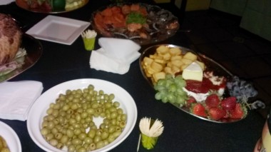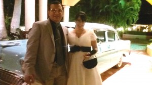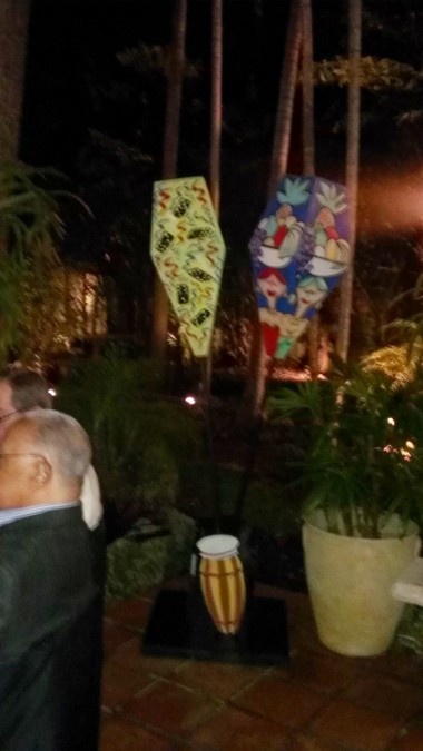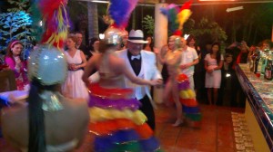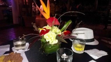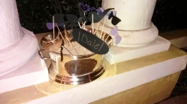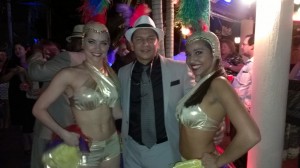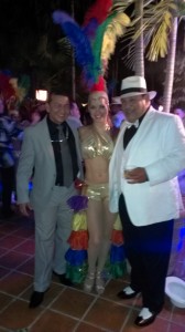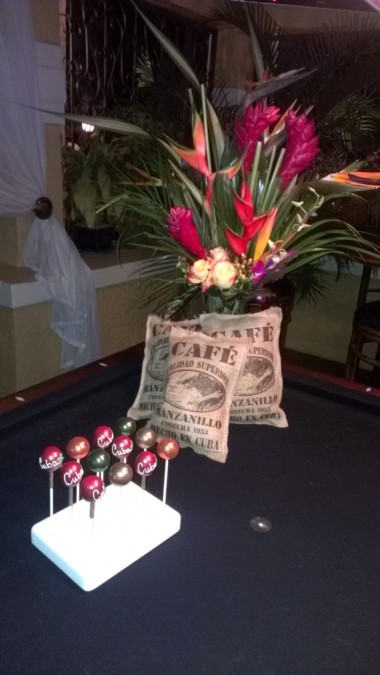Como decoración para la fiesta llevaron estantes con los diseños de rumberos (una pareja) para que se tomaran fotos metiendo las caras; bongós, tambores, maracas, dominó, tabacos, sacos de café, de azúcar, de arroz; centros de mesas de flores exóticas, comida cubana, postres con figuras de dominó, un carro de la época a la entrada de la mansión, música en vivo cubana, dj y para cerrar con broche de oro, un trío de bailarinas que pusieron a todos a bailar… fuera de lugar!